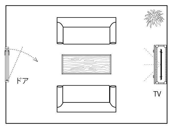 対面のソファ配置は、応接間や会議室など会話・会議が中心の部屋のレイアウトです。ソファを対面になるように配置し、テレビはソファと直角の位置に配置するため首を横に向けないとテレビを見ることができません。テレビは少し見にくいですが、その分会話がしやすいソファ配置となります。